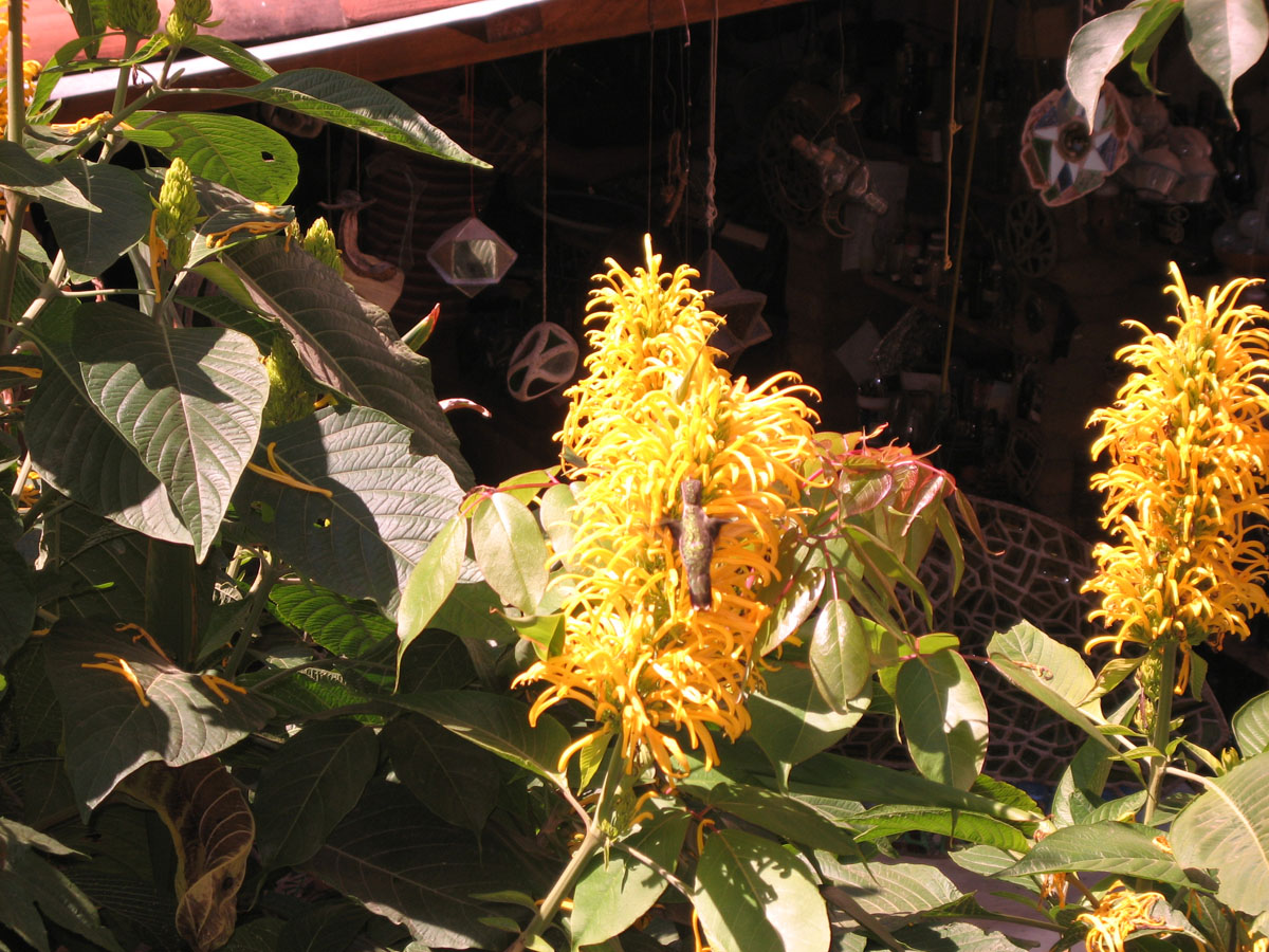 Hard to tell, but there is a hummingbird in the middle of this big yellow flower!