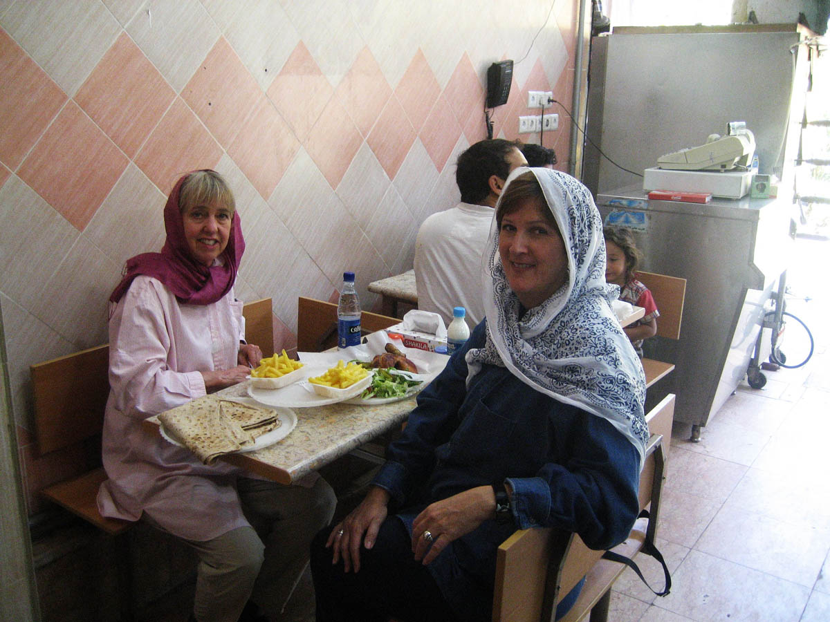 Michele (Calif) and I stop into a typical Iranian "fast food" restaurant to enjoy some roast chicken and lively conversation with the three young men who worked there, all competing heavily for the foreigner's attention. Esfahan, Iran