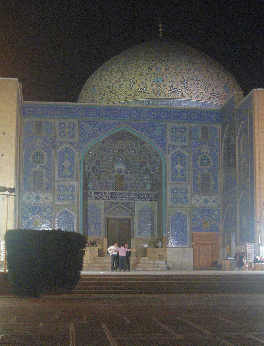 The beautiful blue tiles and cream colored dome of the Sheikh Lotfollah Mosque, one of the many illuminated monuments in Imam Square.