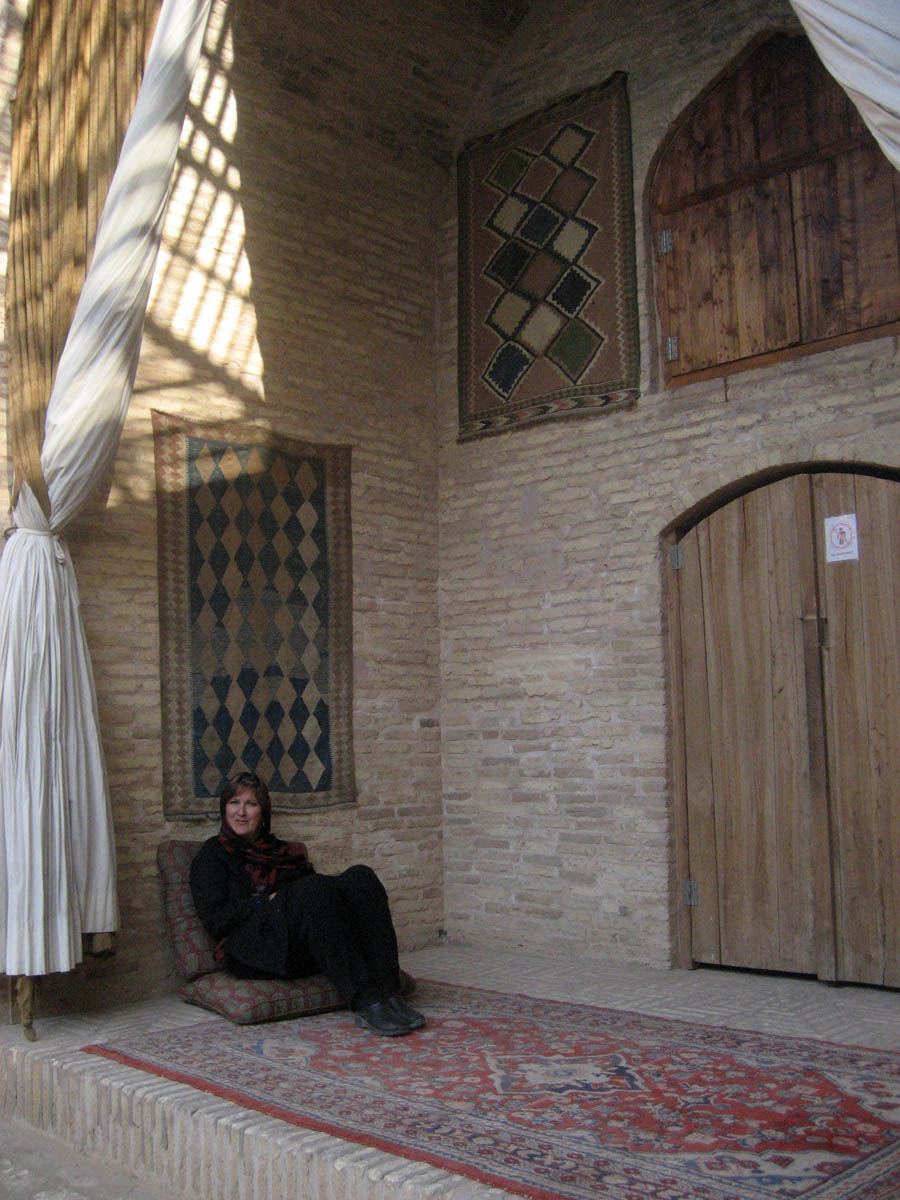 Carving out a little quiet time in the alcove of the 400 year old Zein-o-din caravanserai -- but not for long...