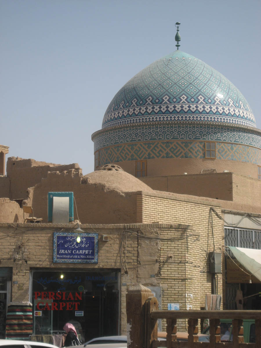 Persian Carpet stores flank the entrance to the Old City -- Yazd, with the blue tiled dome of the Mausoleum of Sayyed Roknaddin, local Islamic notable on the skyline.