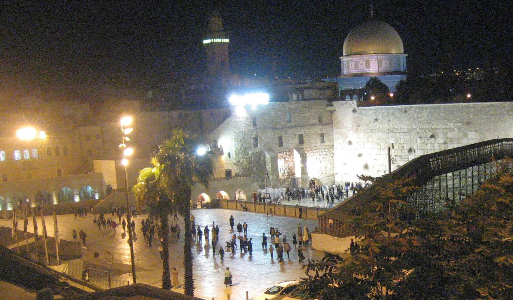 A view of the Old City of Jerusalem by night.
