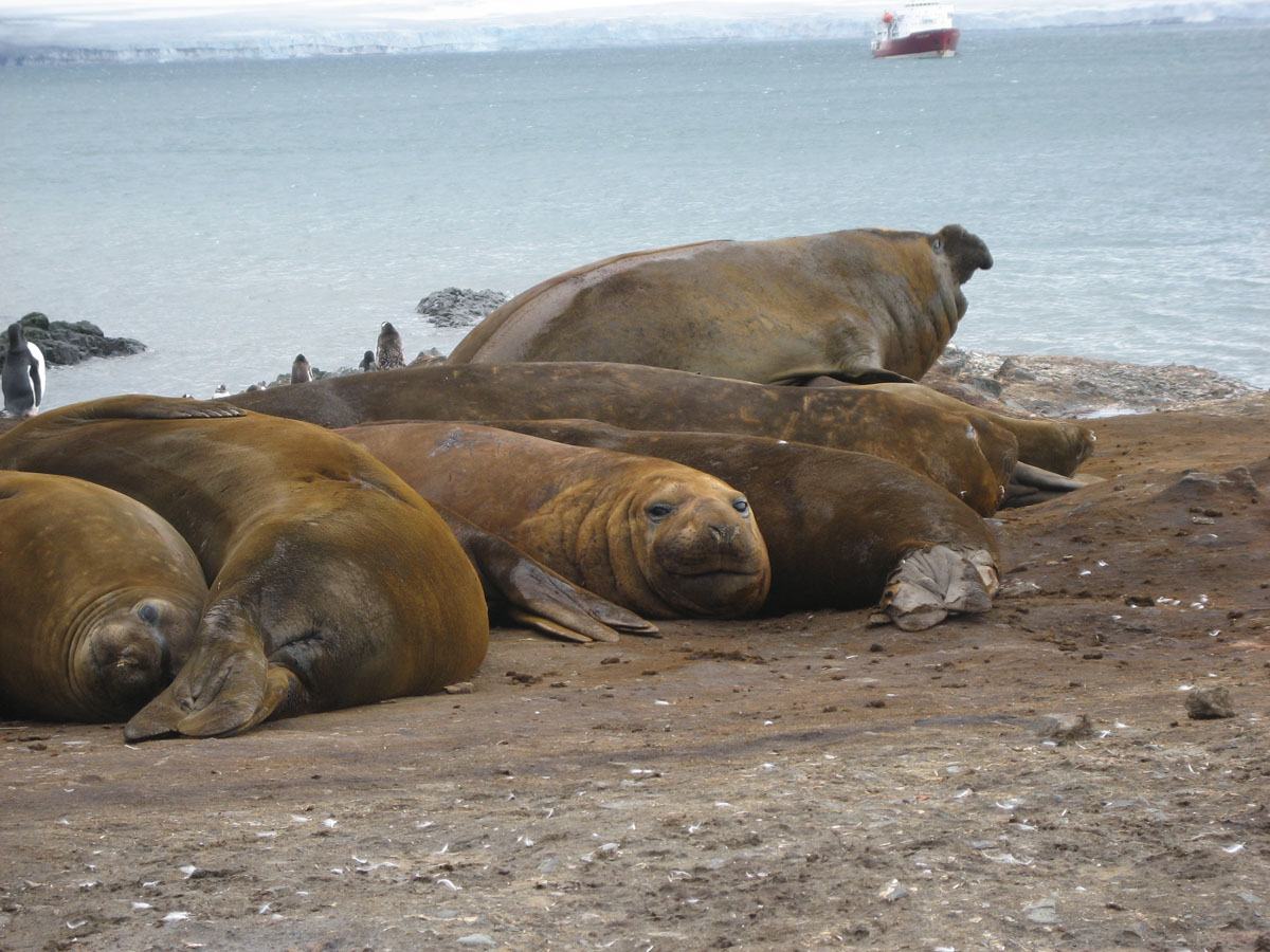 An "elephant seal wallow," as male seals lie in their poop while they molt. The one in the back is getting quite aggressive, and has just tried to crawl on top of another. It is getting VERY loud about now!