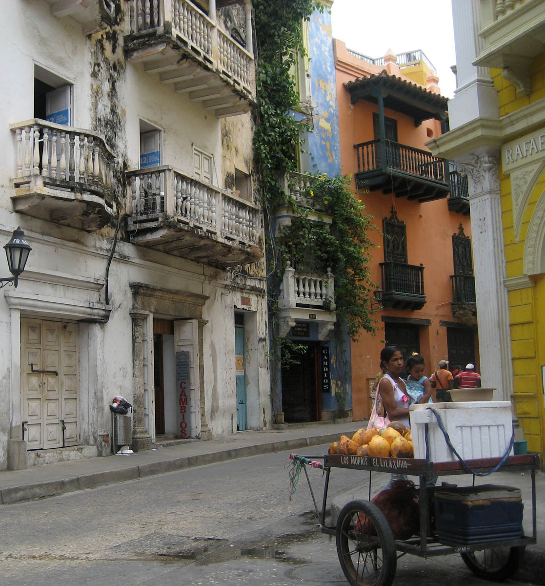 A typical street scene in the Old Town of Cartagena, lined with a variety of tropical fruits for sale.