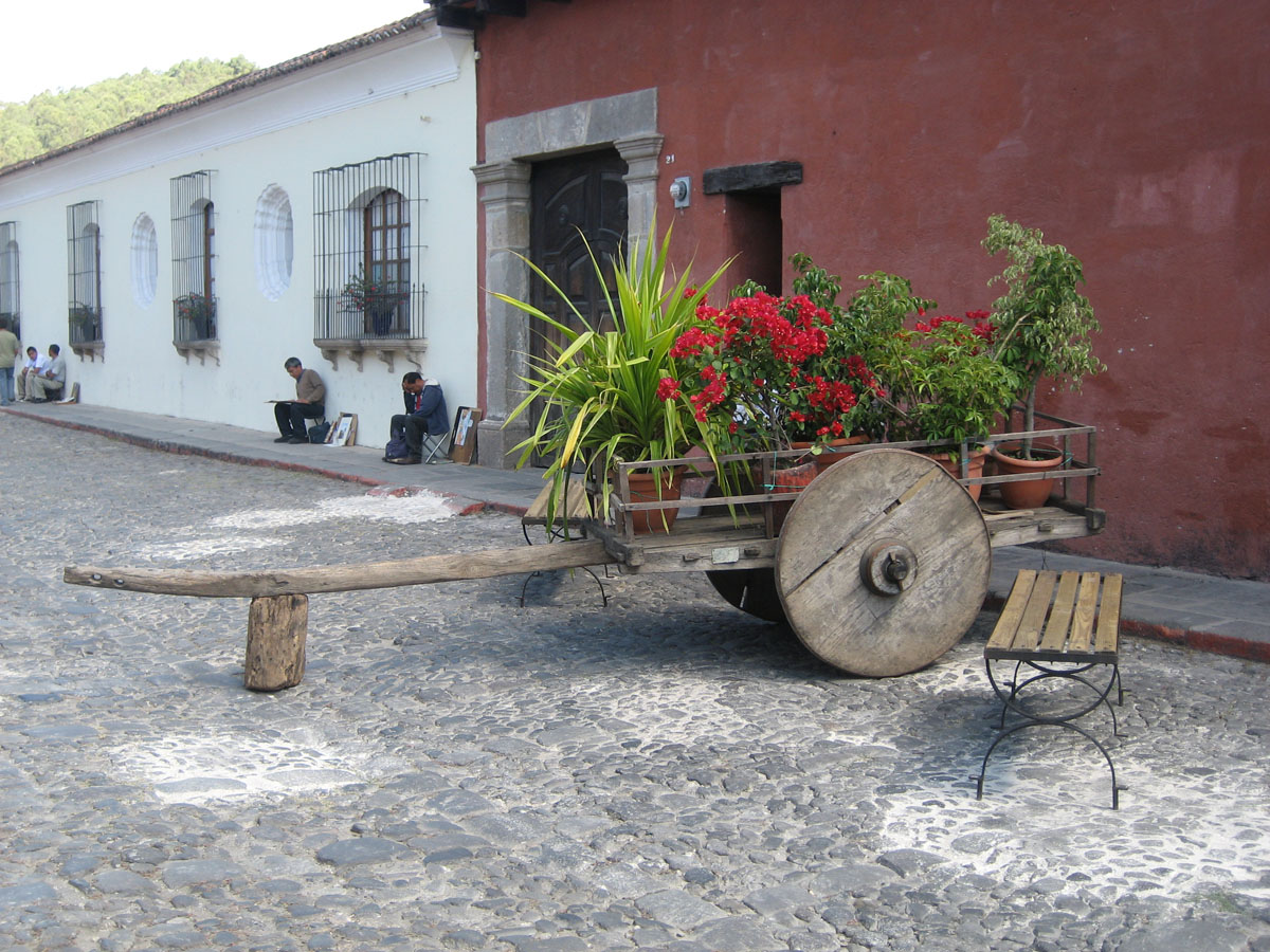 This street is lined with artists sketching the scene of this old ox cart with the volano in the background.
