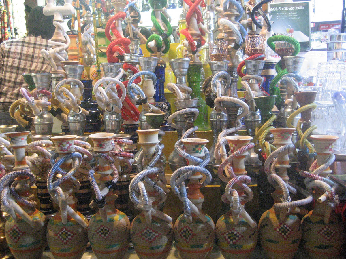 Hookas, or assorted water pipes for sale in the Kerman market.