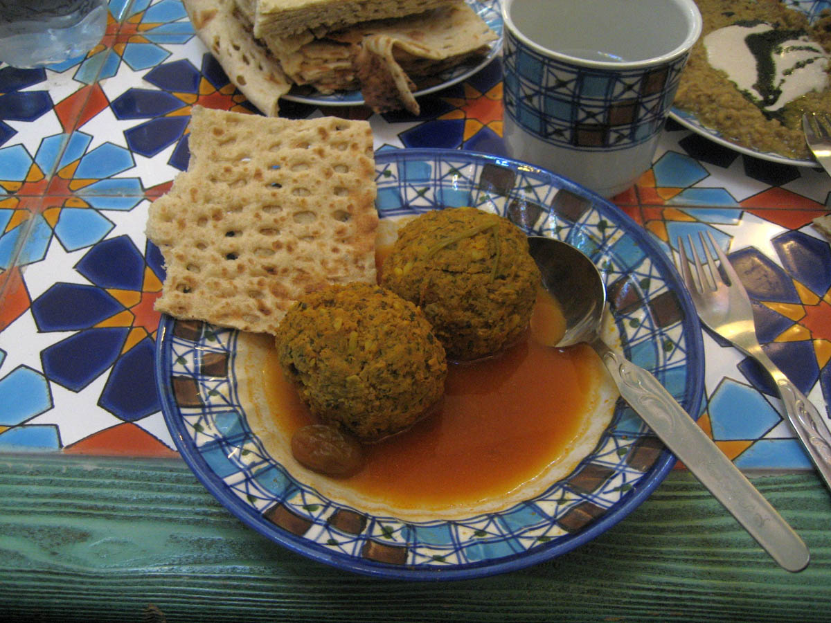 "Koofteh Tabrizi," which is a typical Iranian dish of meat and rice formed into a ball. This version was stuffed with a plum and a walnut, and had a plum on the side.