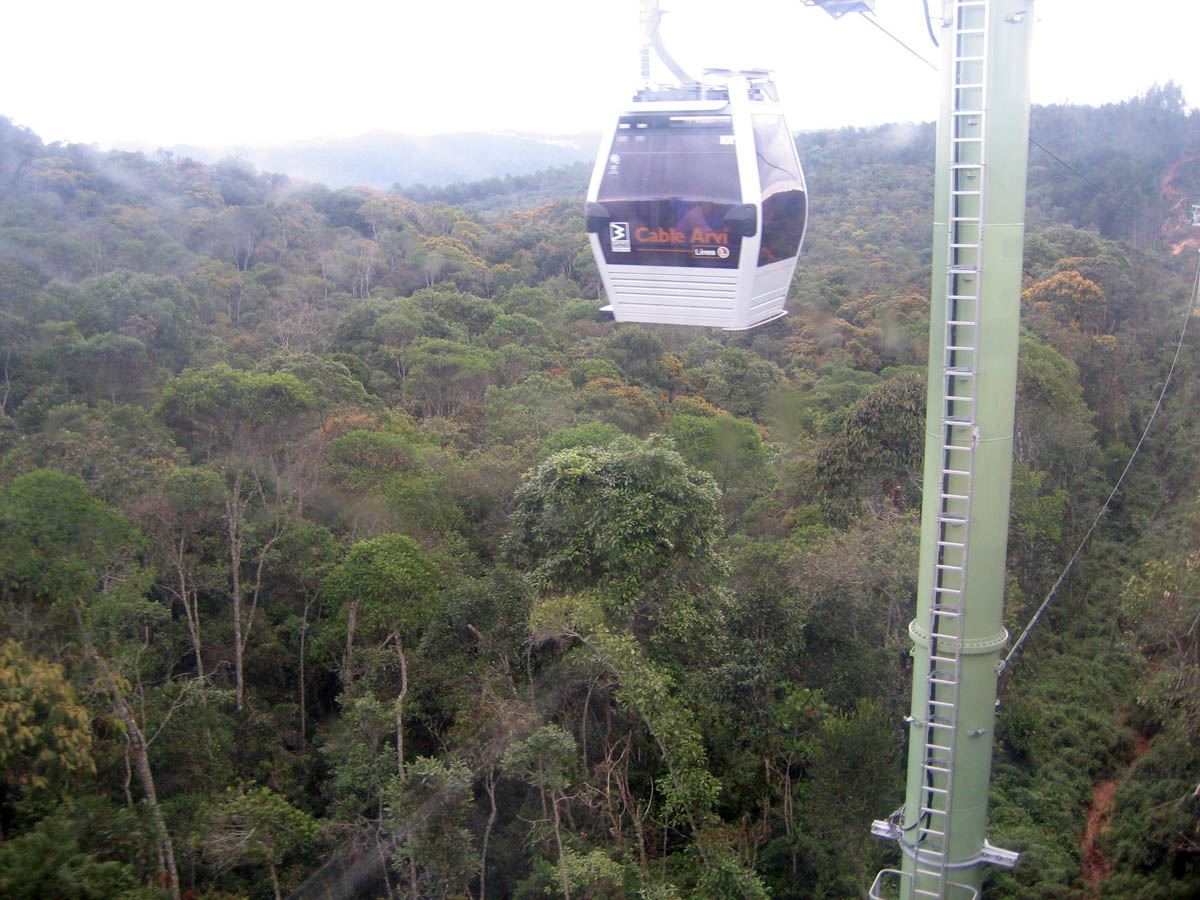 A man in the car with me tells me in Spanish that I MUST take this other car up to the "montana," but I have no idea where it goes. I ride for 20 minutes across the treetops, until I realize the name on the cars has changed to "Cable Arvi'" and it says "parque ecologico!"