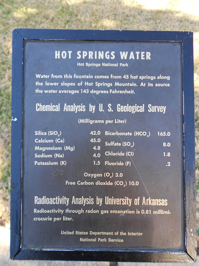 Plaques posted on the fountains show mineral content of the water, which comes from 45 hot springs averaging 143 degrees Fahrenheit.
