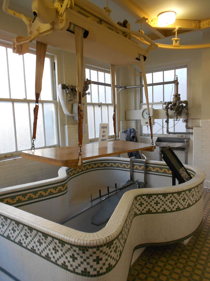 The "Hubbard Tub," installed in 1939, was used for treatments for the physically impaired. Notice the overhead transport for non-ambulatory patients.