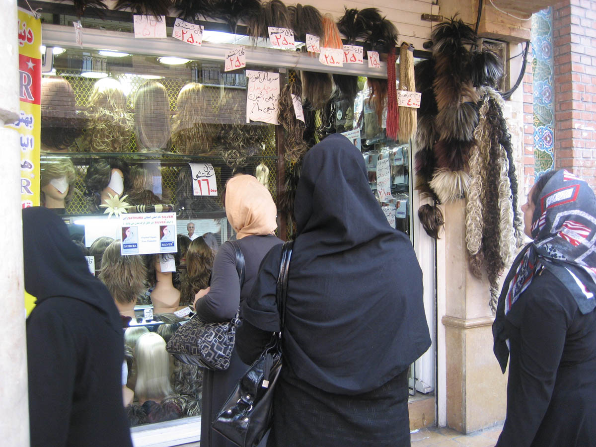 Even though hair must be covered by decree of Islamic law, hairpieces seem to still generate quite a business. Typically, the younger and more stylish the woman, the bigger the pony tail bulge under the "hejab," or headscarf.