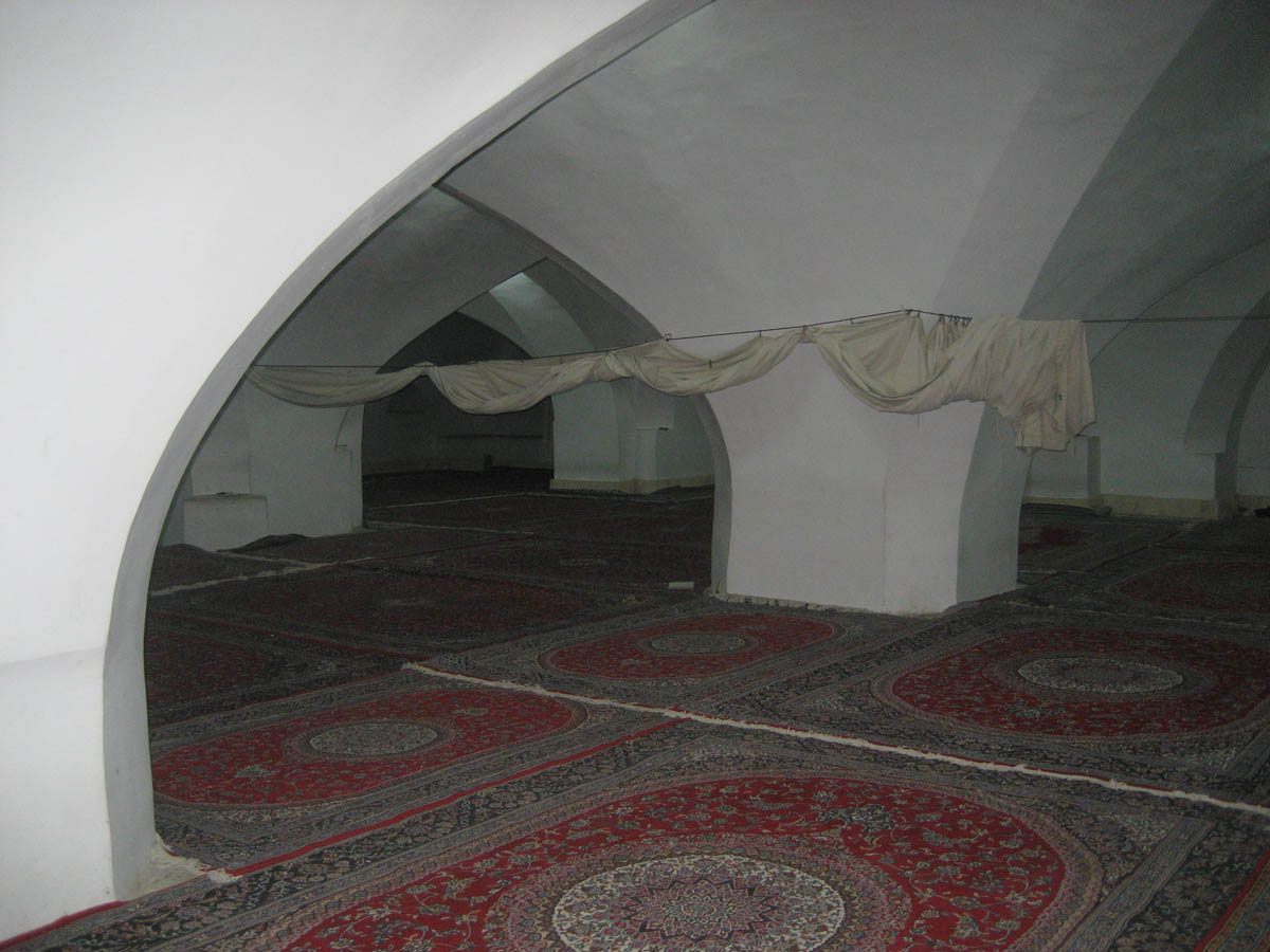 The Jameh's "Winter Hall" built in 1448, and lit by alabaster skylights. Still used for prayer today, the white sheet suspended from the wire separates the women from the men.