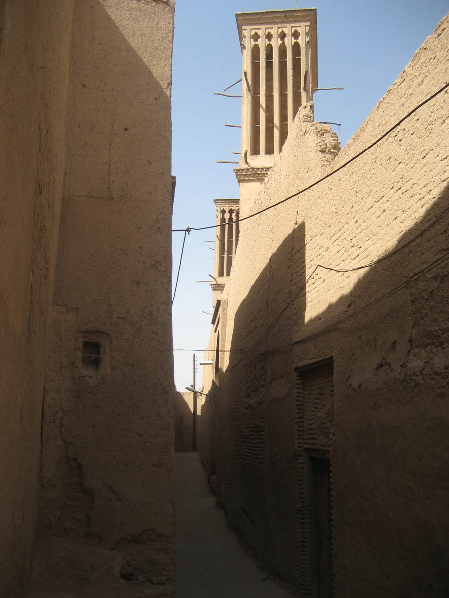 Typical alleyway in the old city of Yazd -- The tall structure is a "badgir," or wind tower, which catches the breeze and provides natural air conditioning to the room below the tower.