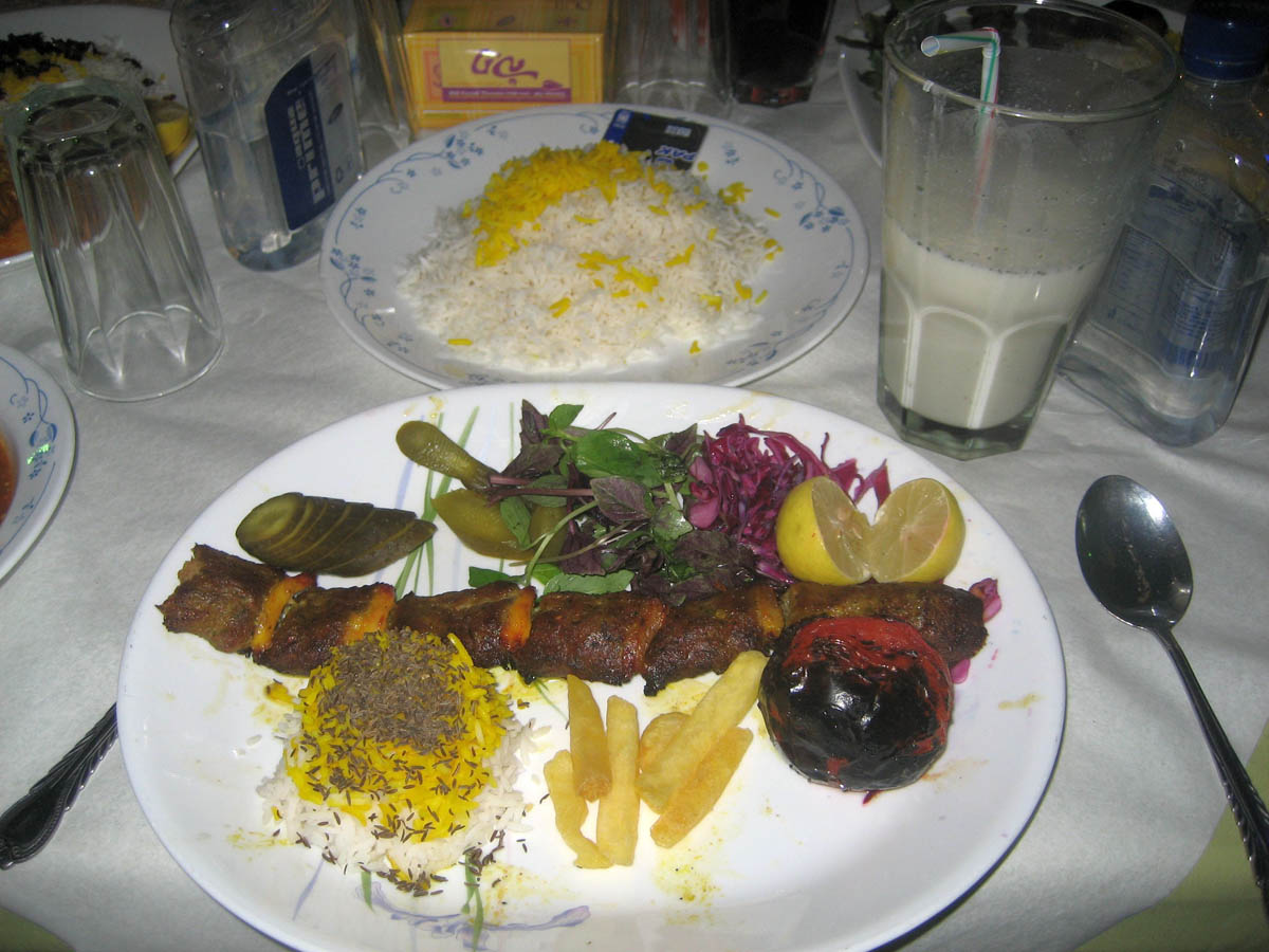 This was lamb "kabab," always served with saffron-topped rice, roasted tomatoes, a few green herbs, and sliced pickles. The white drink was "duque," a refreshing herbed yogurt drink.