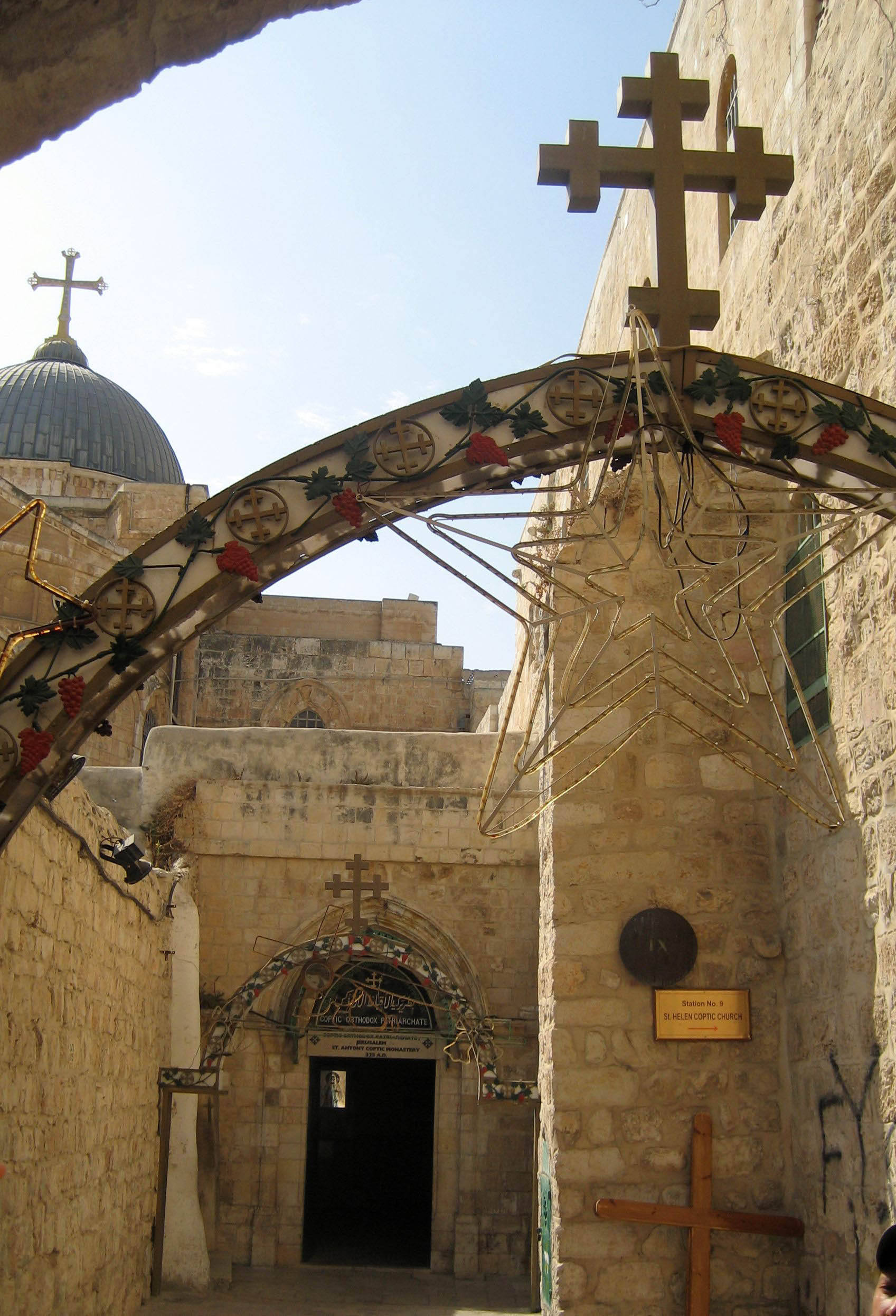 Back street leading to the Church of the Holy Sepulchre. The round brass wall mounting showing the "IX" indicates the Ninth Station of the Cross. Note wooden crosses in the corner for pilgrims to carry to the church.