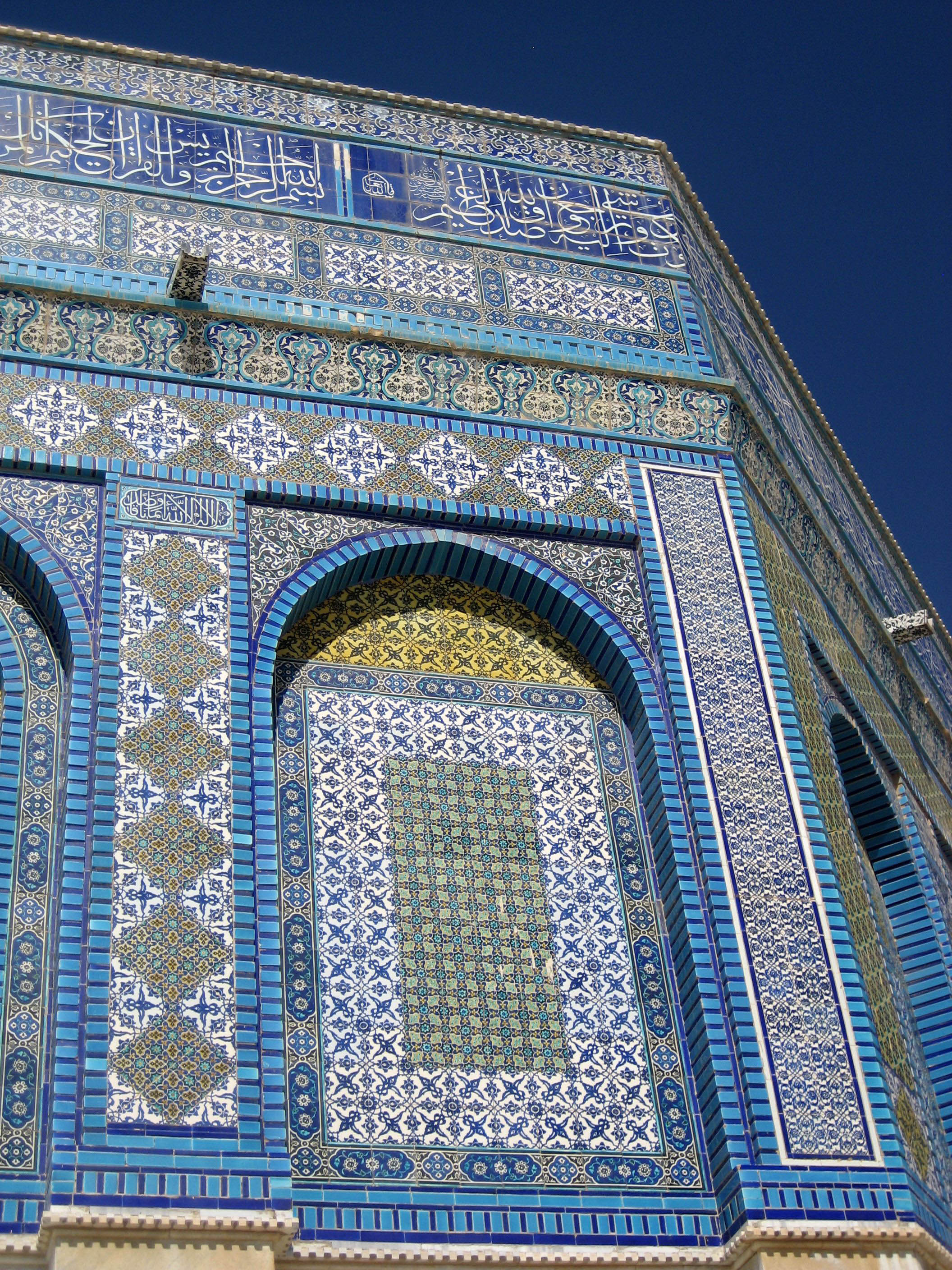 The octagon-shaped structure is covered in beautiful turquoise, cobalt blue, yellow, and white tiles with scriptures from the Qu'ran around the top.