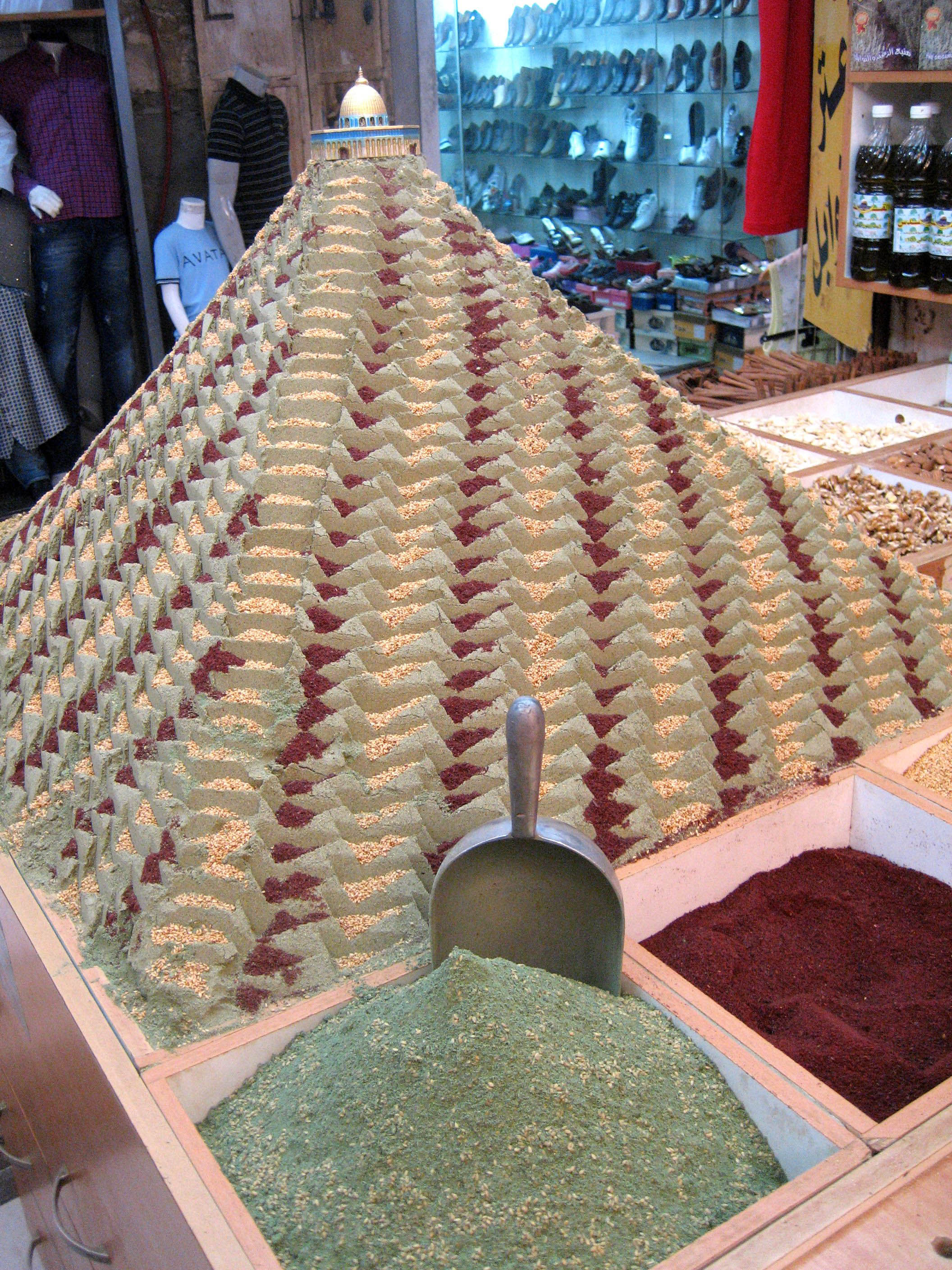 Spice seller gets very creative with spices, decorating with paprika and sesame seeds.