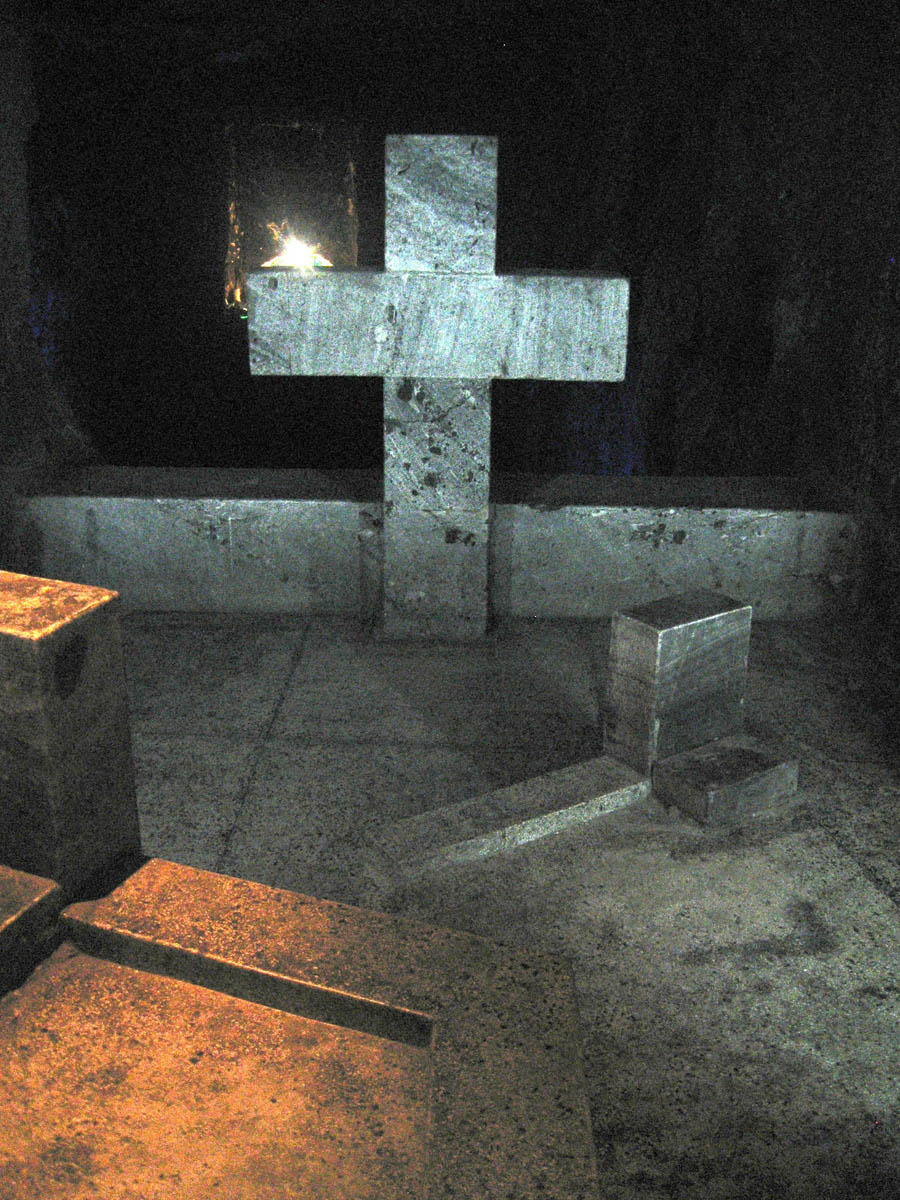 Along the entryway of the church, there are 14 small chapels representing the stations of the cross, illustrating the events of Jesus' last journey. Each station has a cross and several kneeling platforms carved into the halite structure.