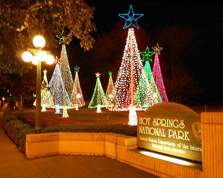 Entrance to the Hot Springs National Park in holiday decor, it is the smallest of all National Parks and the only one located in an urban center.