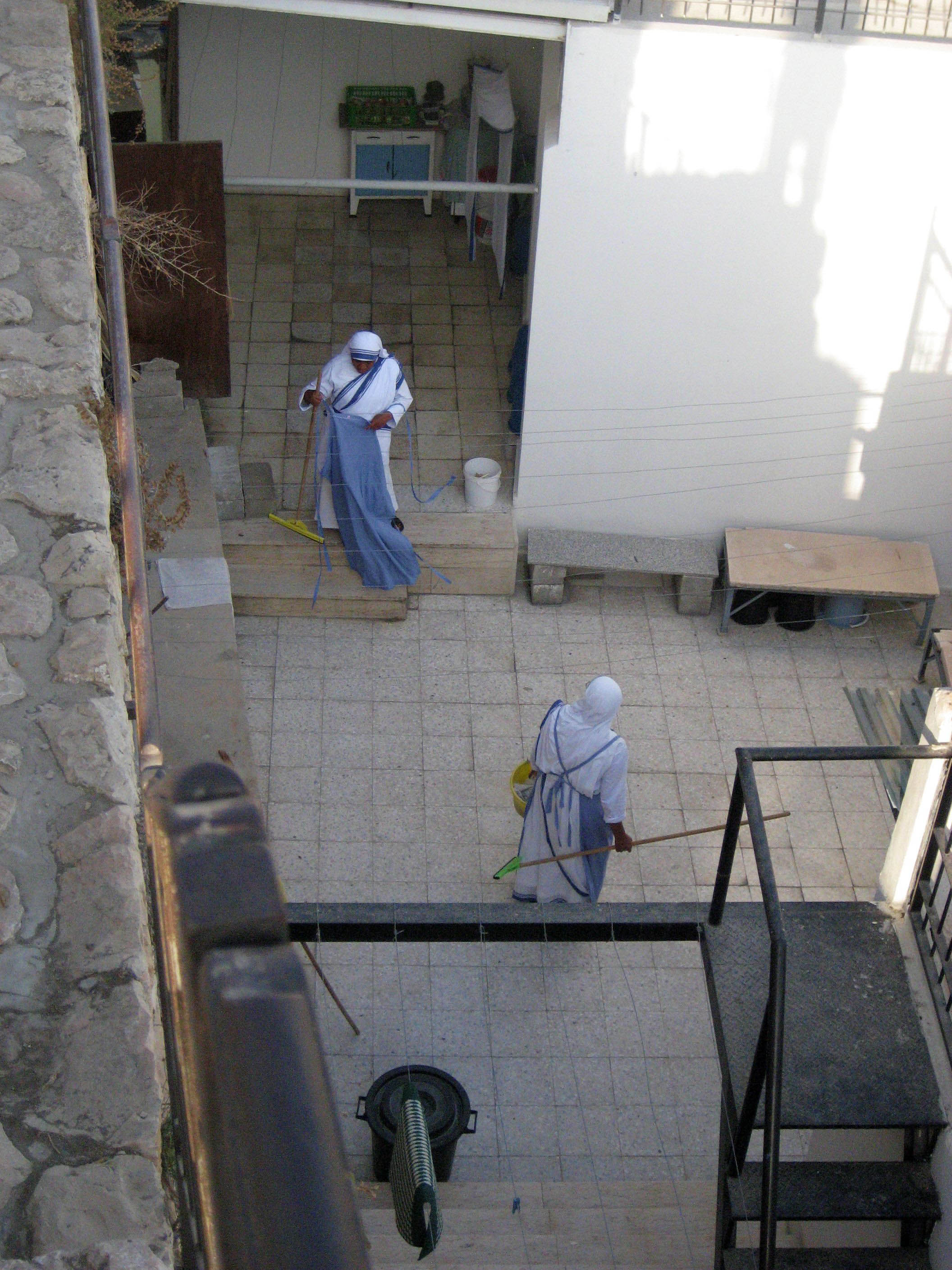 The walls look down on many open courtyards, this one is Christian I presume, because they are dressed like Mother Teresa's Ministry of Charities.