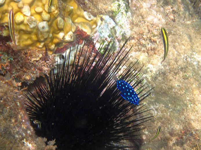 Beautiful blue spotted fish seeks refuge from me among the evil, spiny sea urchin. Little does it know....