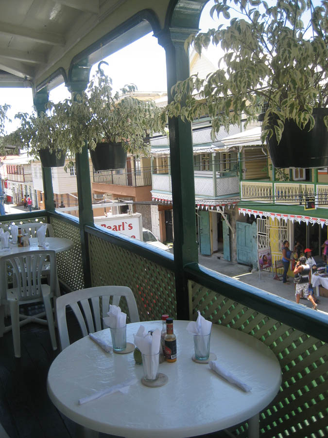 Pearl's Kitchen has a balcony overlooking King George V street, a main street in downtown Roseau.