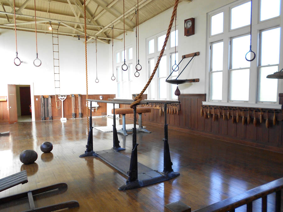 Old-style gymnasium was geared more toward gymnastic-style equipment such as rings and balance beam.