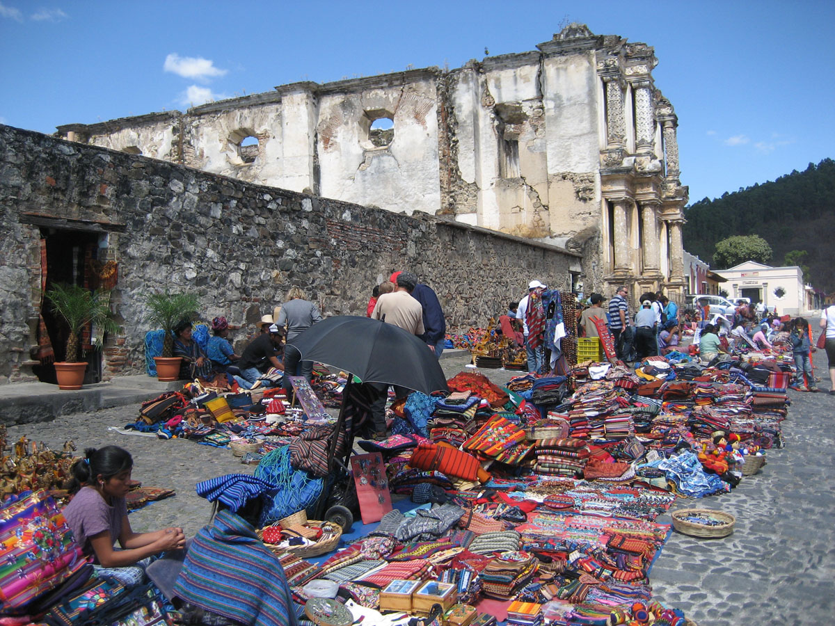 Local Guatemalan women in typical dress sell wares in the street in front of the Artisan Market