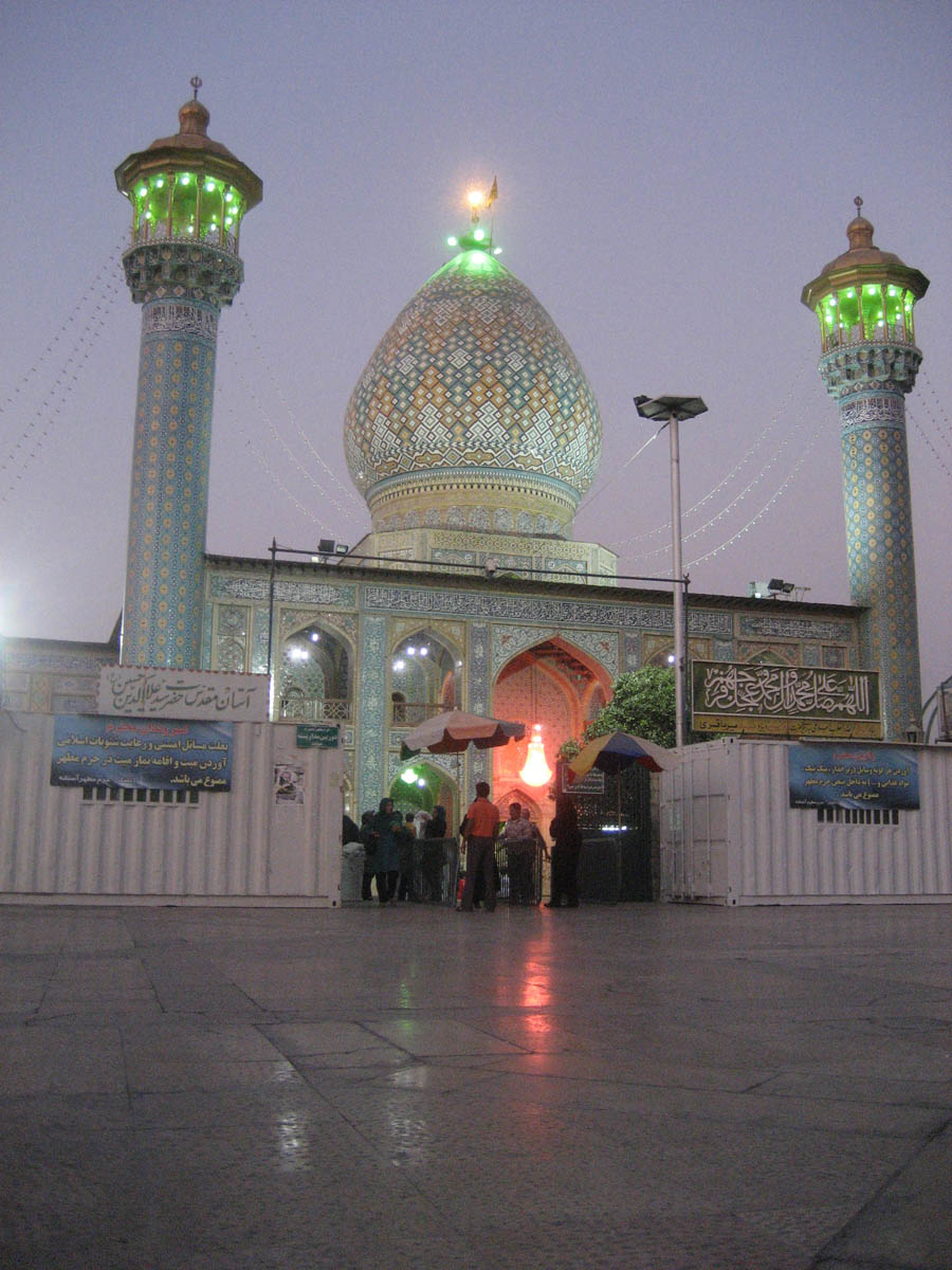 Mosque minarets are typically lit up with green light, the color associated with Mohammad, and serve as beacons for prayer. Nasir-ol-Molk Mosque, Shiraz