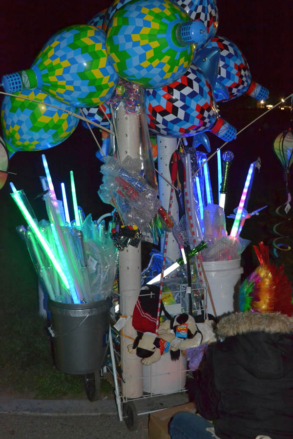 Kiosk selling lots of balloon junk (Check out the vendor's "hat" in lower right corner.)