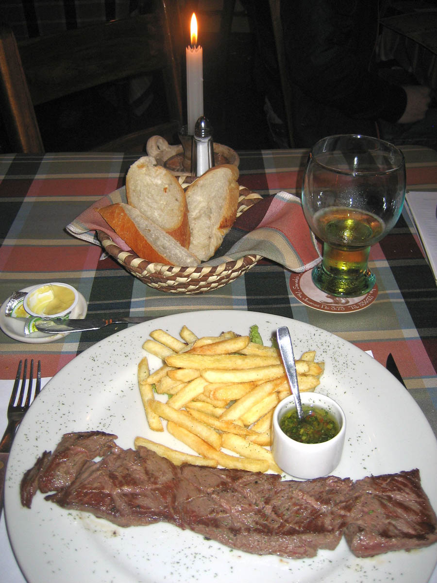 This is the "Baby Beef" entree, a strip of beef with a tasty sauce of garlic, parsley, peppers and oil on the side. Cost was approximately $11 USD.