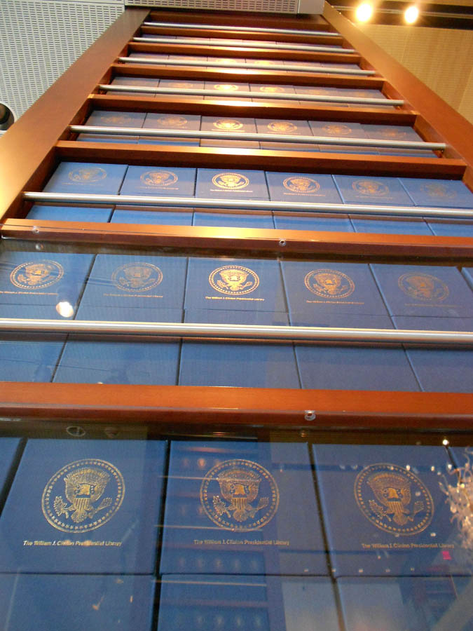 Floor to ceiling columnar bookcases containing 5,000 archival boxes, each bearing the Presidential seal. These 28 ft columns contain only 8% of the documents from the Clinton administration.