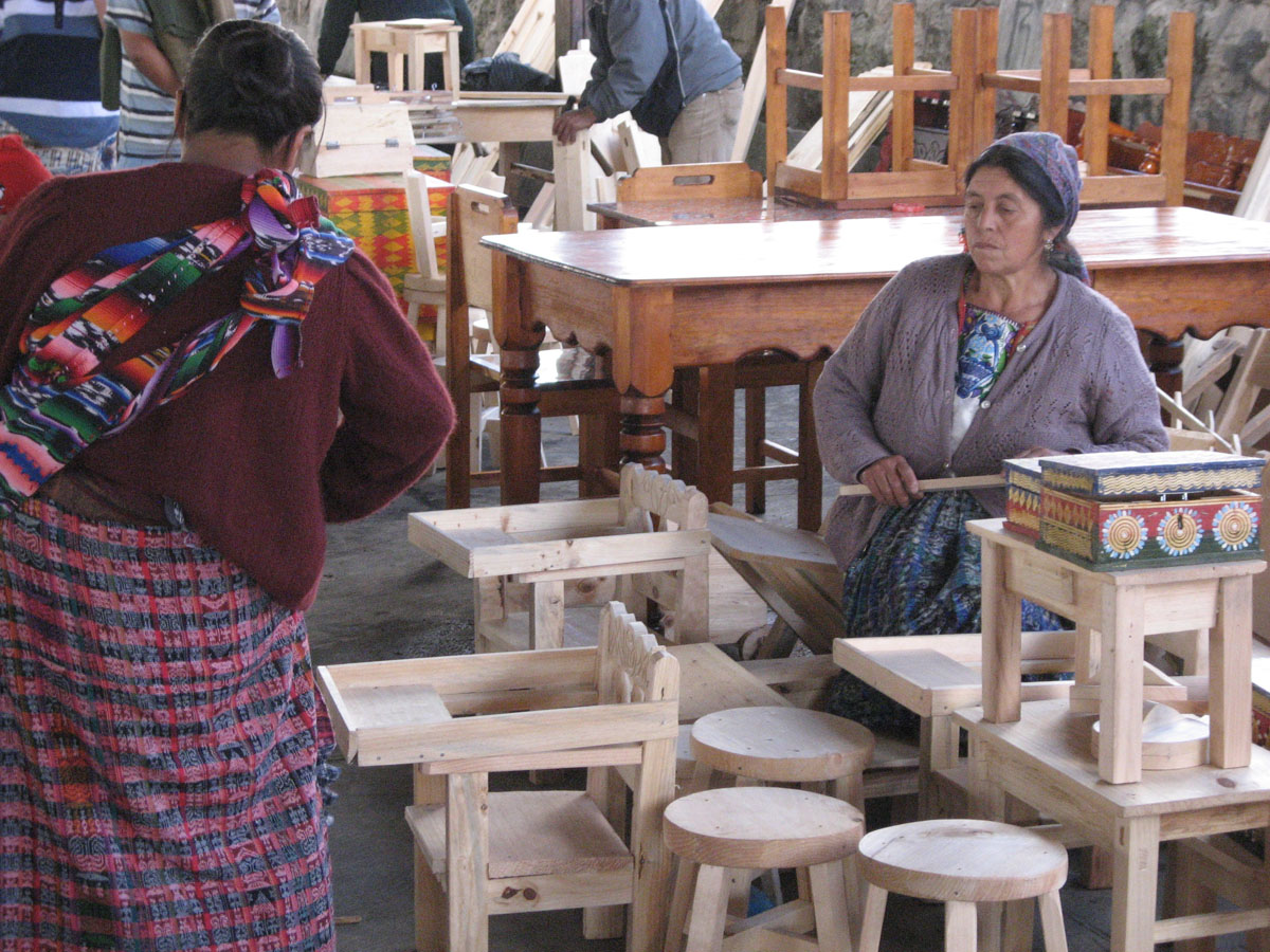 Woman with baby in sling examines high chairs for sale in the furniture market.