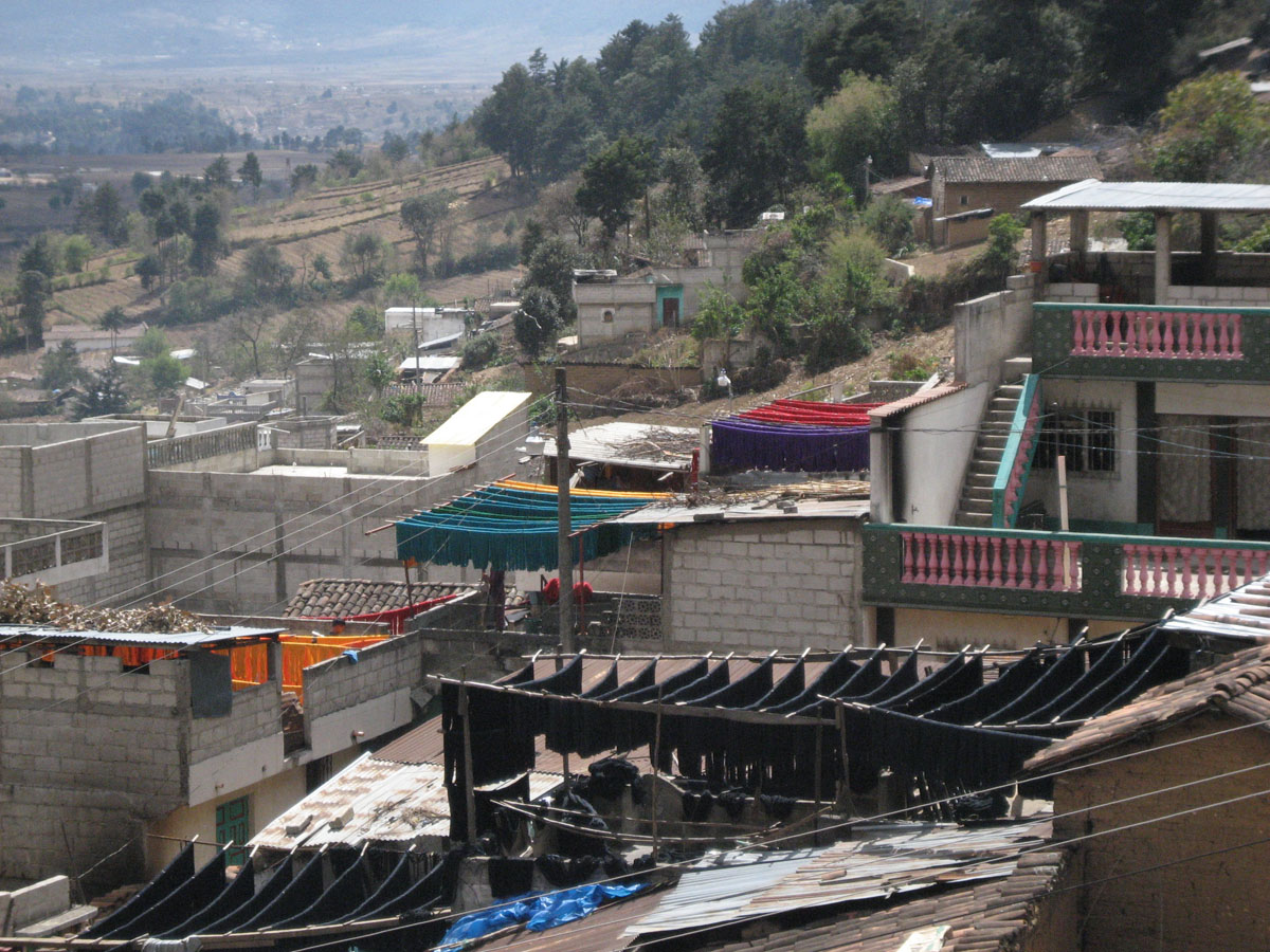 This tiny hillside village of San Andreas Xecul is known for dying yarn. Note black, yellow, green, purple, and red yarns drying.