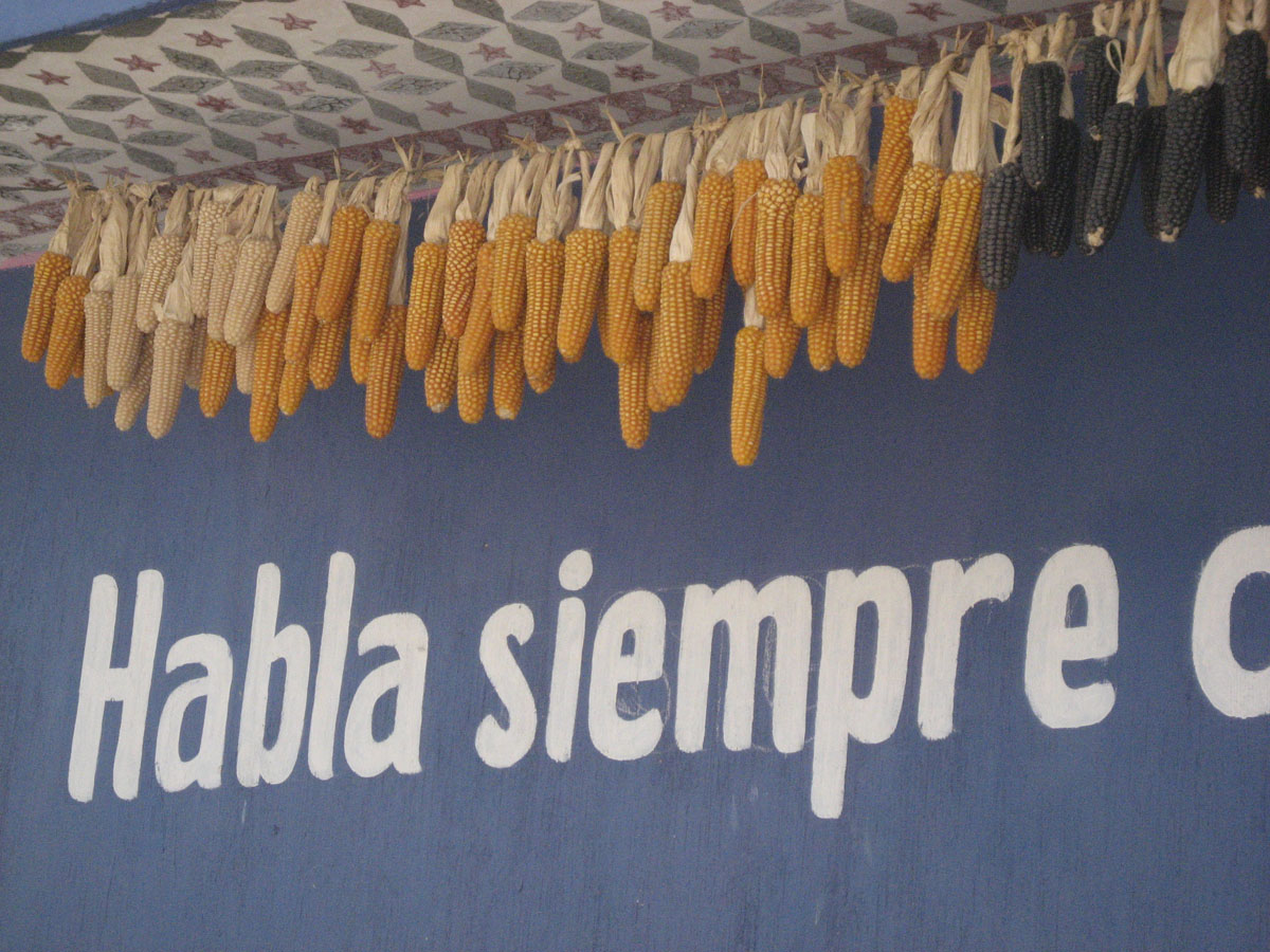 Yellow and black corn hanging to dry to be used for seed for the next crop rotation.