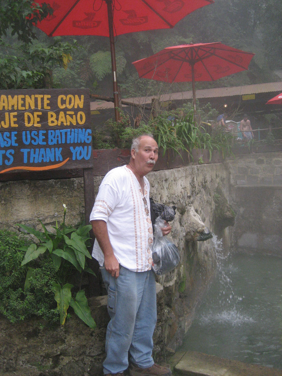 We arrive way up in the mountains at Fuentes Georginas (pronounced "Fuentes Hero-HEE-nas") Don tests the water at the hot springs...after too many cold showers in Guatemala, he is READY!