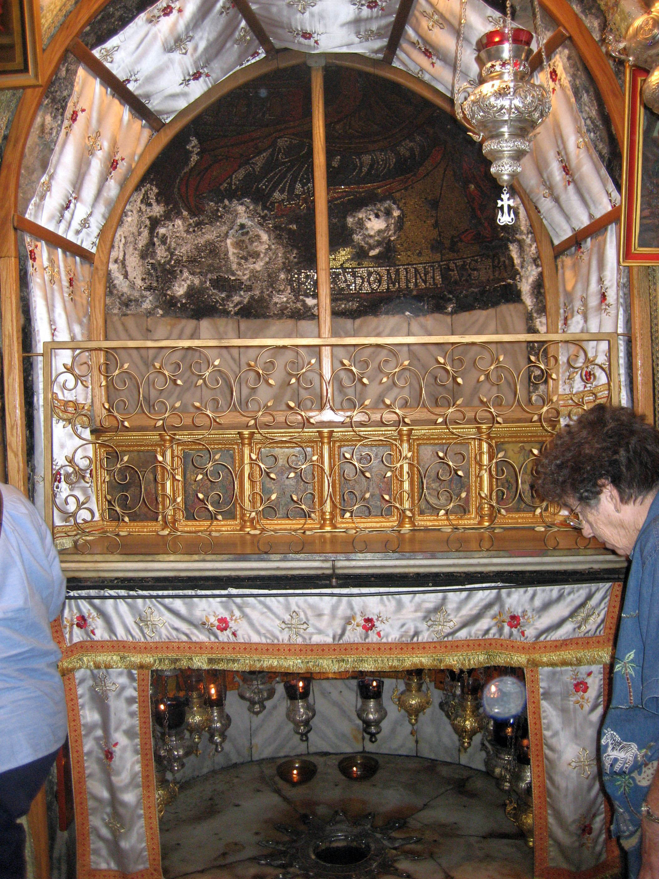 Pilgrims line up to get on their knees and touch, kiss, or place their souvenirs over the star for a blessing.