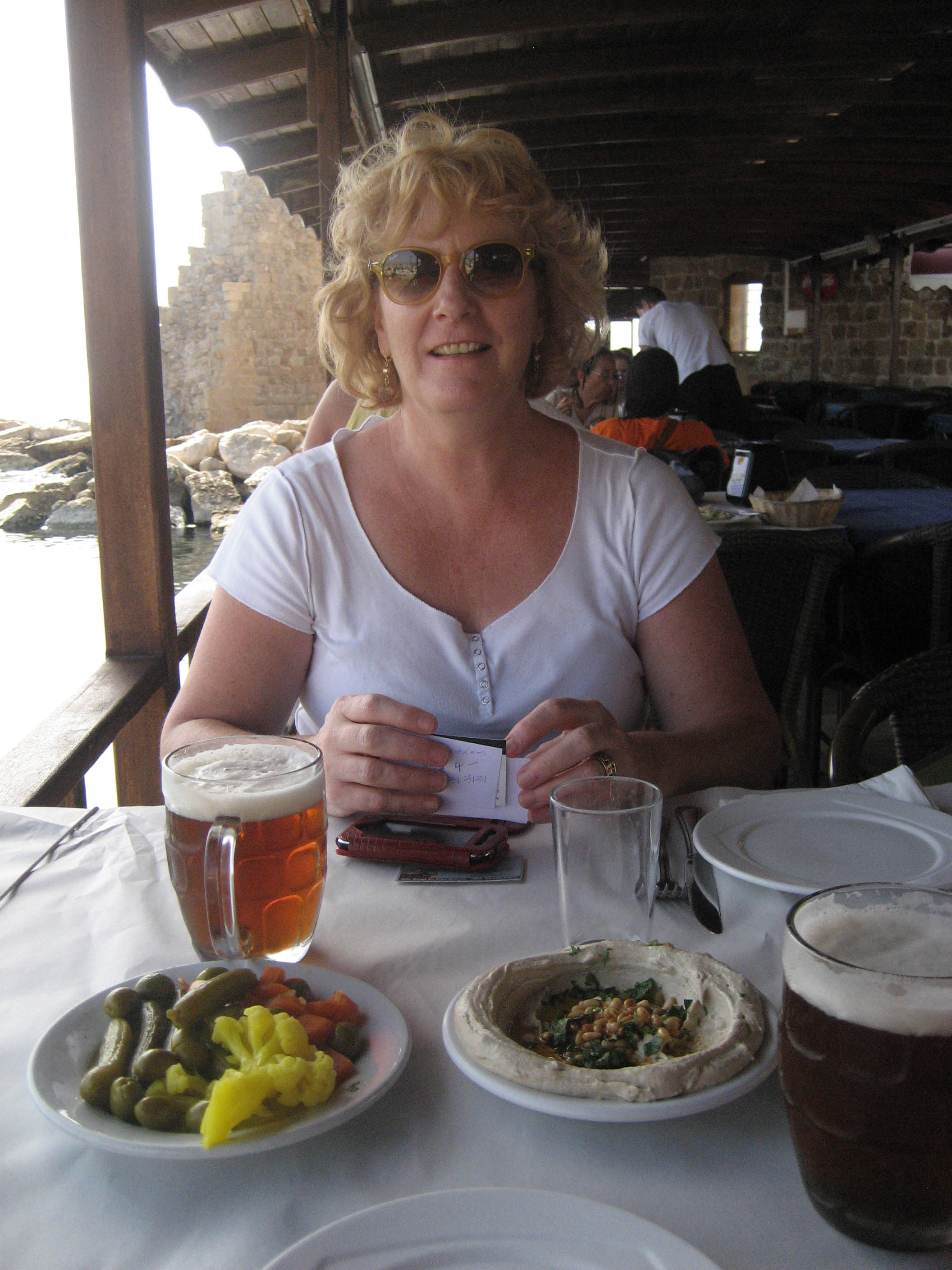 Lynn and I share a plate of tasty hummus with pine nuts and a couple of beers while swapping travel stories. It was fun to compare experiences of traveling solo through Israel, as she had been extremely brave to rent a car and drive.