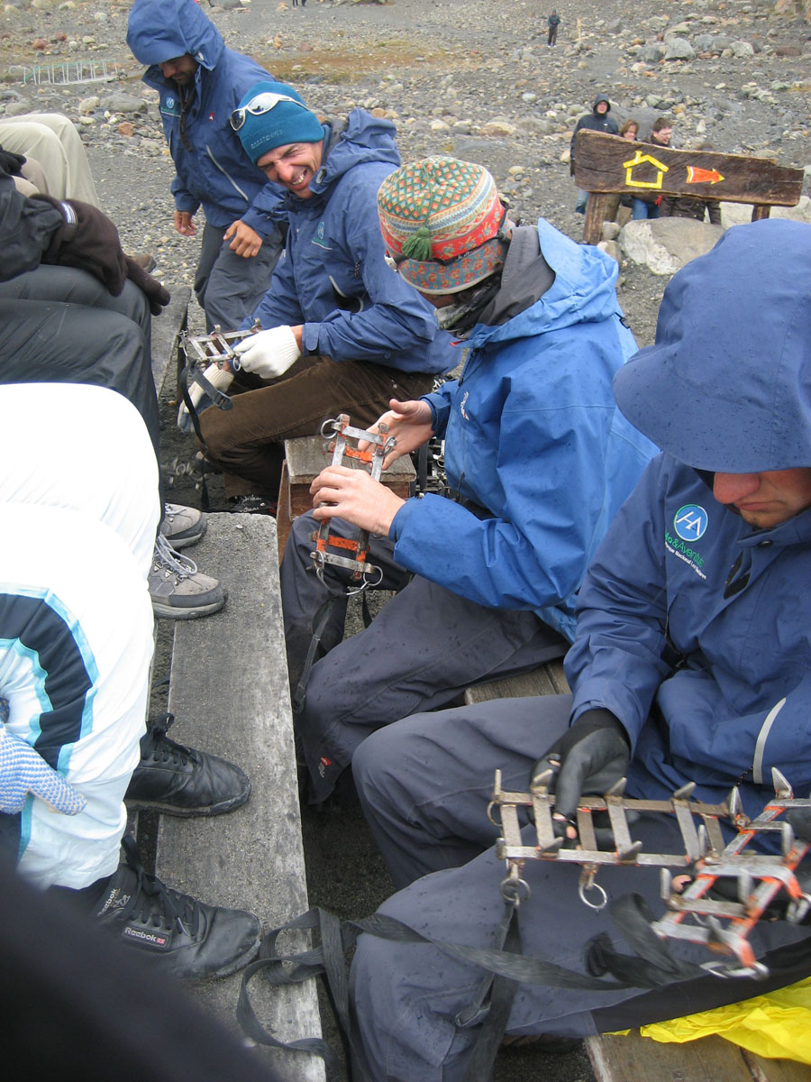 Guides tightly lace crampons onto our boots for the mini-trekking tour onto the glacier.
