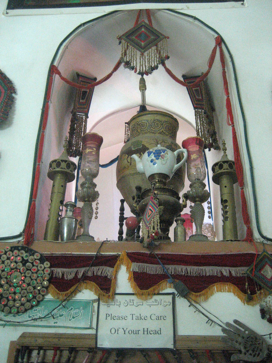 "Please take care of your head" on exiting the Qeysarieh Tea Shop. There was a bit of a delay upon exit as it was prayer time, so we had to sit and wait while the waiter and cashier dropped to their knees for evening prayers before they could take our money.