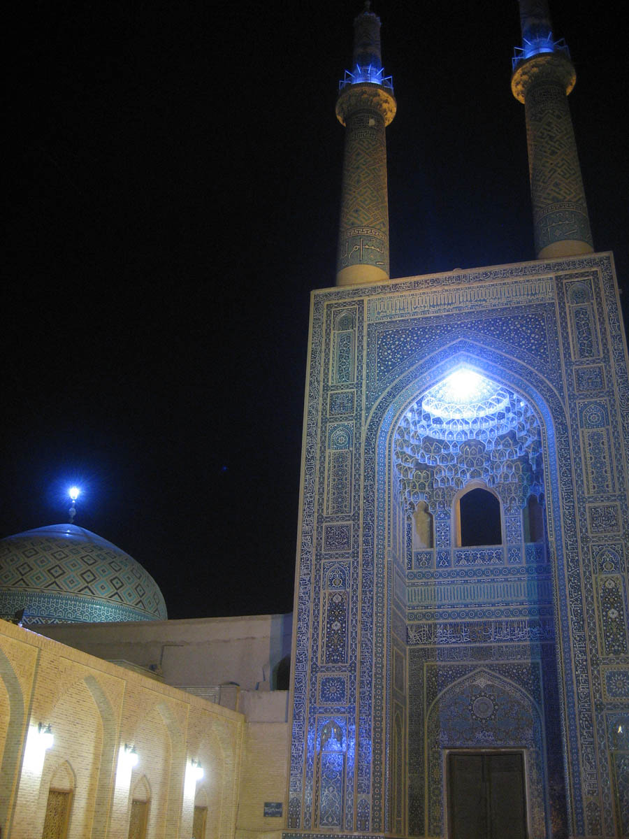 The Jameh Mosque was bathed in beautiful blue light at night.