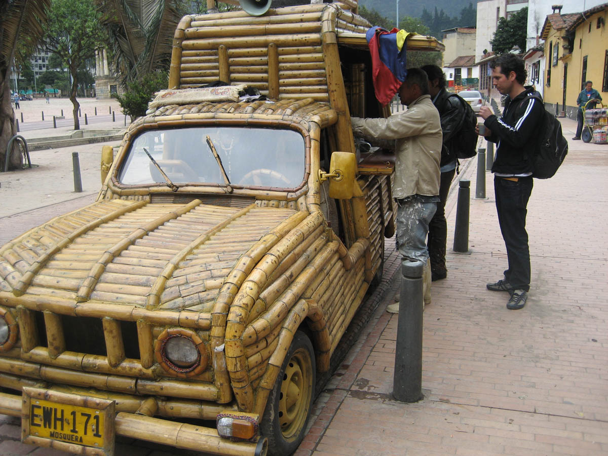 I see this car that is completely covered in bamboo, so I go over to see what is inside...