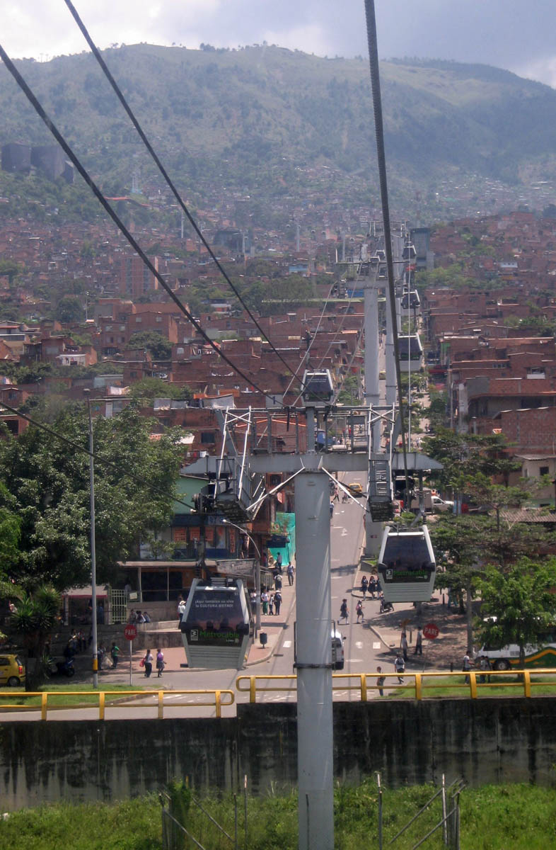 These mountainside dwellings are accessed by an elaborate system of cable cars called "Metrocable," pronounced "metro CAB'-leh," part of Medellin's mass transit system.