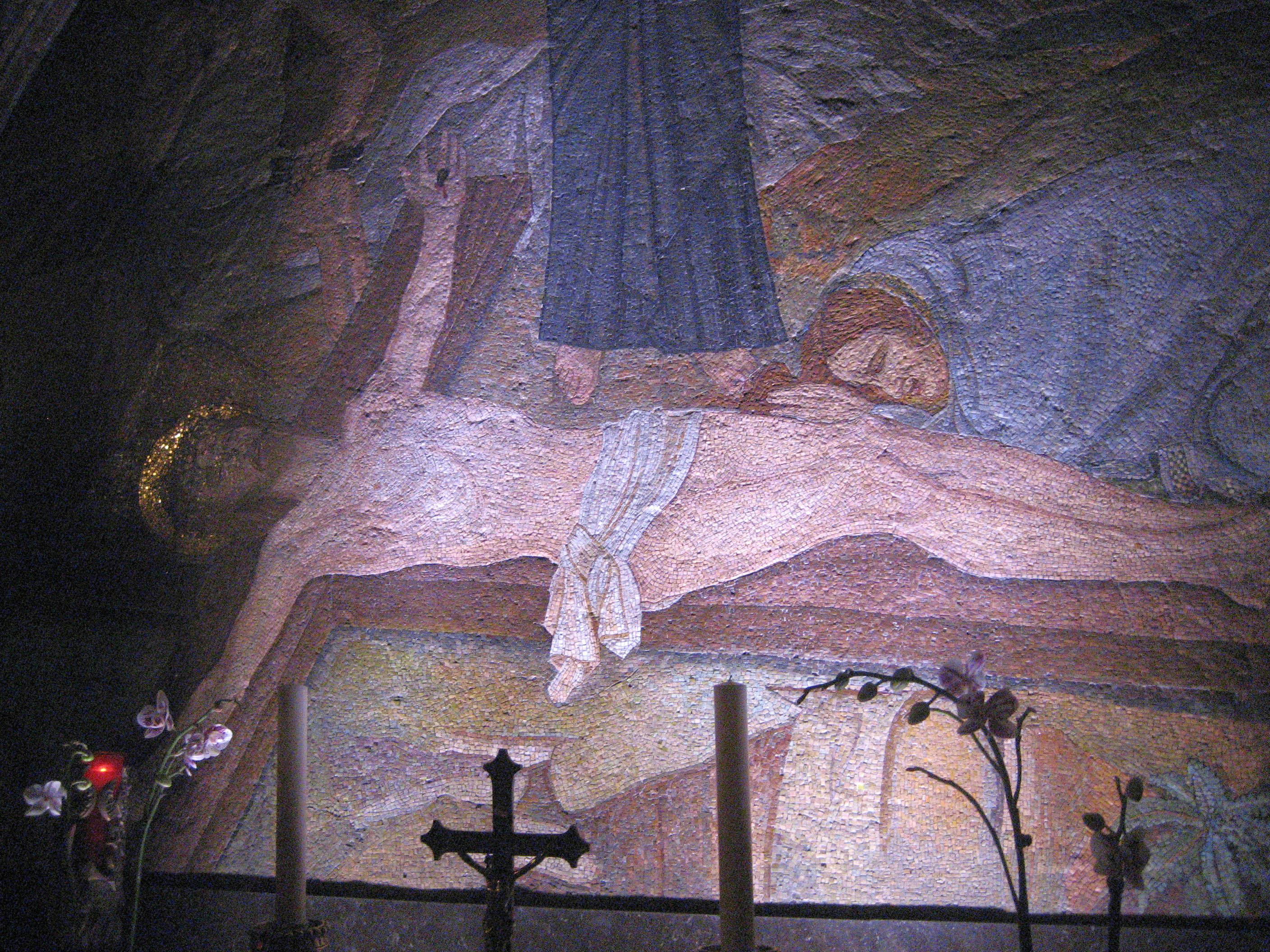 Station of the Cross #XII inside the church of the Holy Sepulchre, mosaic depicting Jesus having died on the cross.