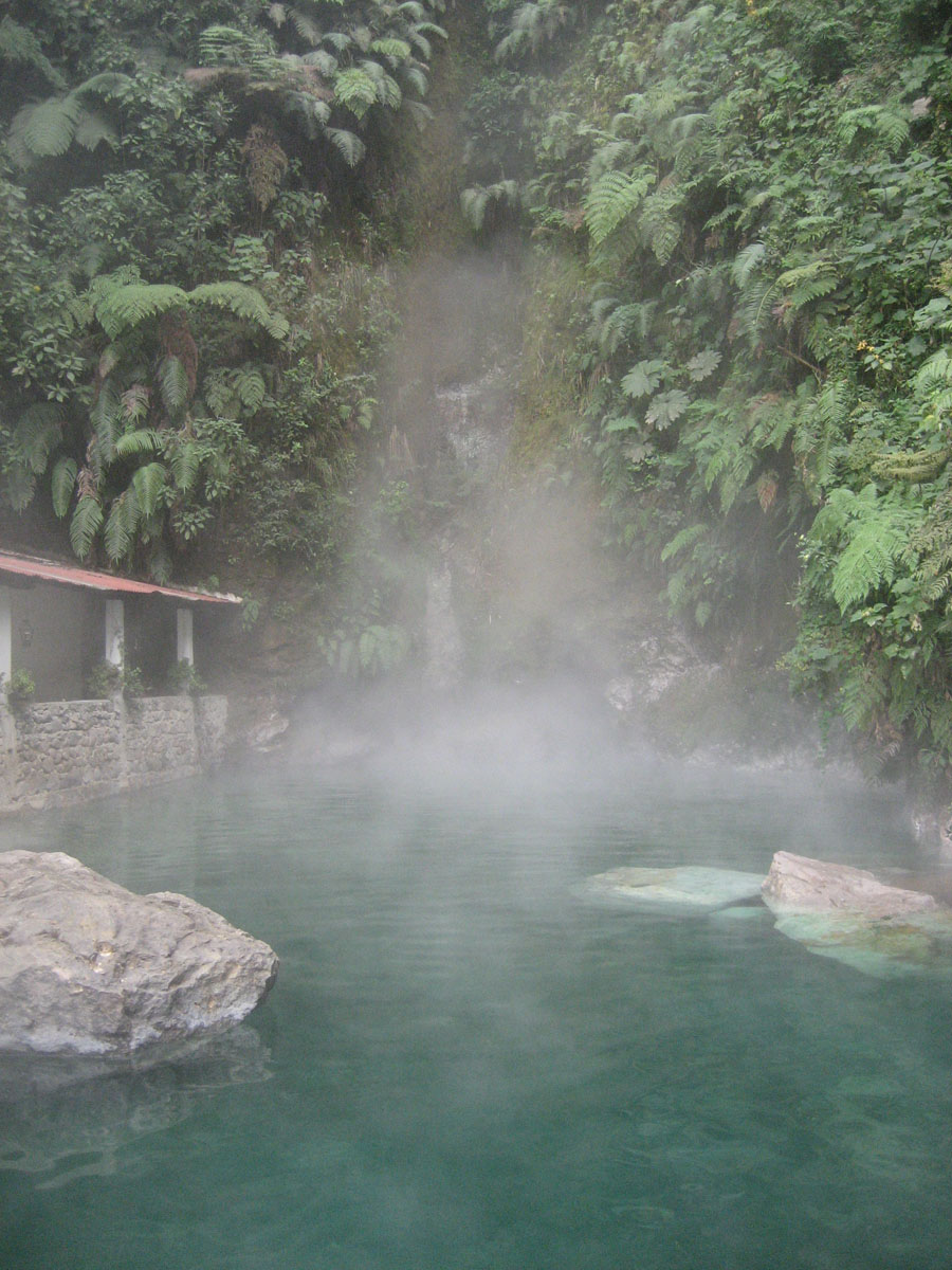 Heavy steam through the lush vegetation is where near boiling water flows from the volcanic vents.
