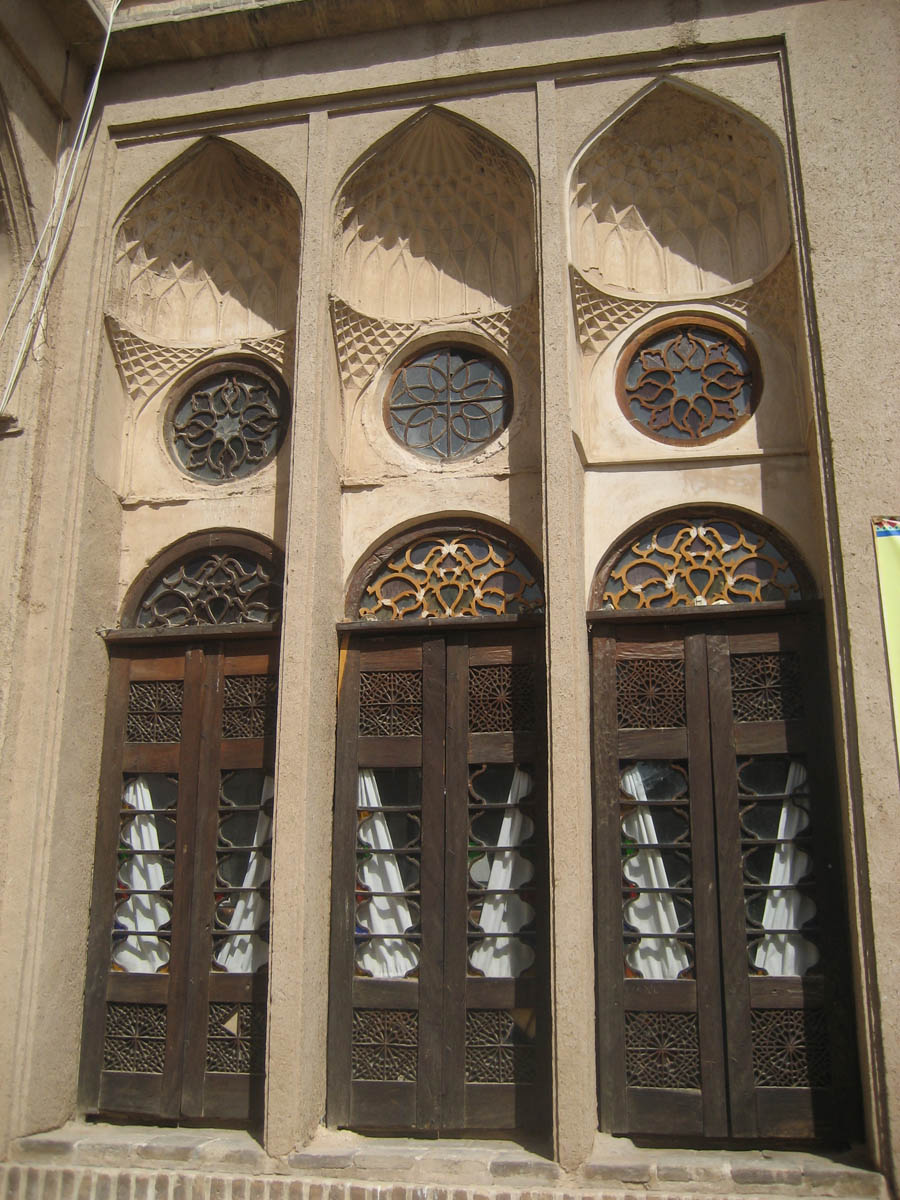 Traditional Iranian homes from the Qajar era have rooms surrounding a courtyard which typically have either three or five doors, often glass or stained glass -- Lariha House, Yazd.