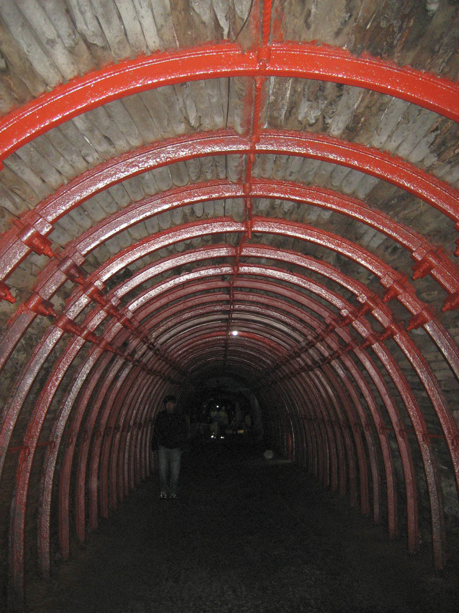 The tunnel at the entrance to the salt mines was lined with logs of eucalyptus, held in place by iron rungs. The wood helps absorb the salt and stop the iron rungs from rusting.