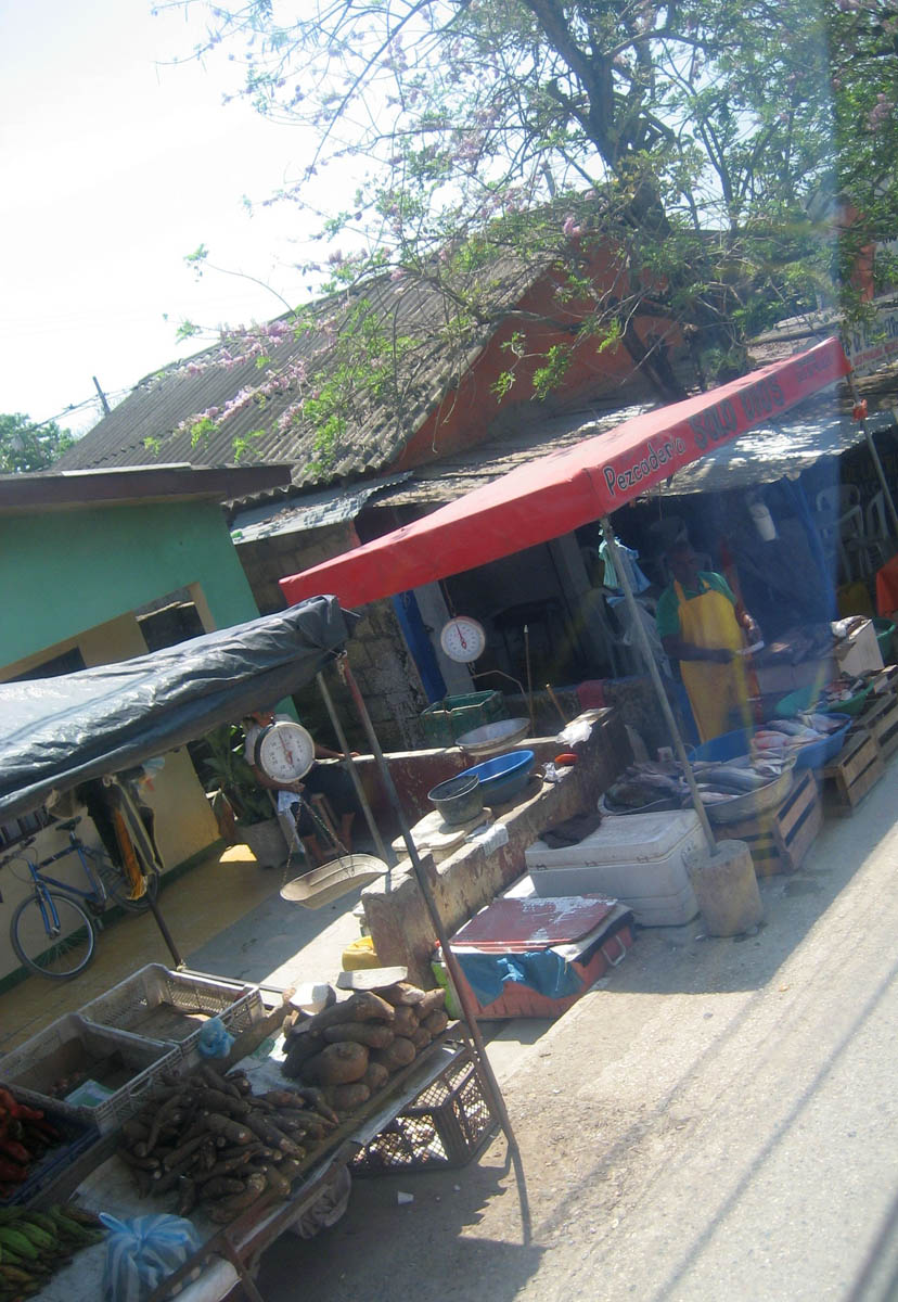 A vendor stall along the highway to Cartagena -- the guy in the yellow apron is manning a fish stall selling whole fresh fish.