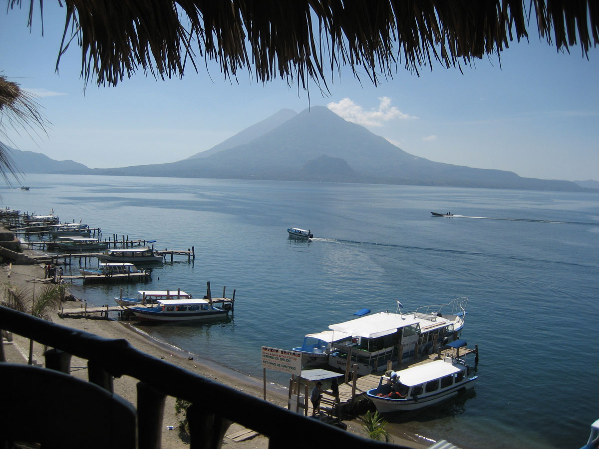 The beautiful twin volcanoes across the glassy Lake Atitlan