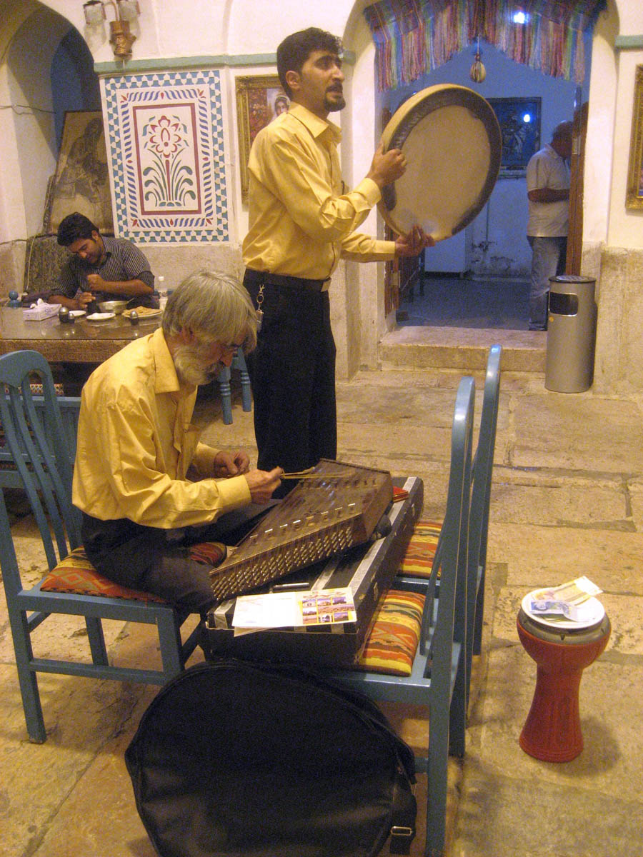 A two-man band plays traditional Persian music for us on instruments that resemble a tambourine-style drum and a cross between a sitar and a xylophone.